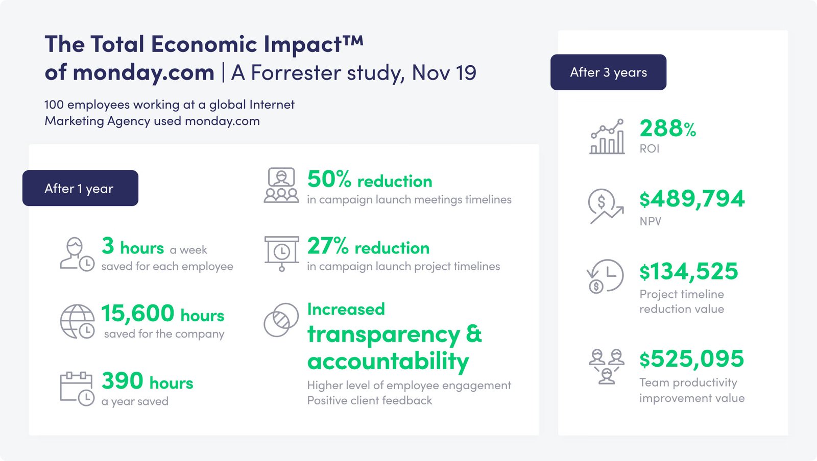 According to Forrester report, an interviewed organization saw significant improvements in campaign launch efficiency with monday.com, thanks to streamlined workflows, automation, and enhanced communication. The platform fostered transparency, accountability, and employee engagement, while generating positive client feedback. Based on these results, the organization expanded monday.com adoption to HR, sales, and business development, strengthening cross-team collaboration and overall business performance.